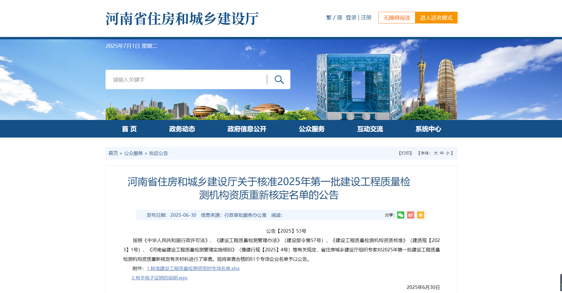 熱烈祝賀我司通過河南省住建廳2025年第一批建設工程質量檢測機構資質重新核定?。。?